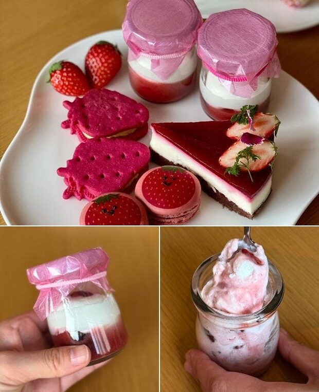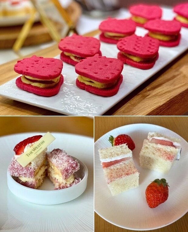 写真上:ストロベリーショートブレッドサンド/写真左下:ストロベリーラミントン/写真右下:ストロベリーサンド