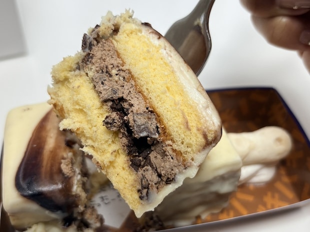 ふんわりとしたココアスポンジには少しパサつきを感じる部分もありますが、たっぷりのチョコクリームと一緒に食べることで軽やかな食感に変化します。