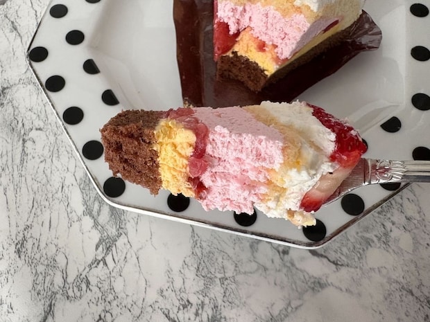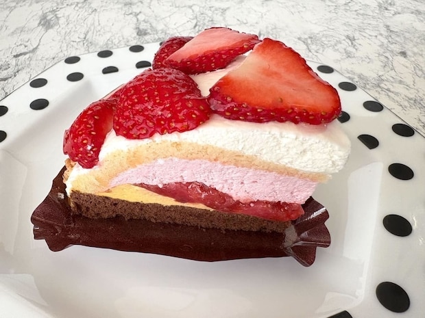 断面を見ると、底のチョコレート生地、黄色のみかんクリーム、いちごソース、いちごクリーム、スポンジ、ホイップクリームが美しく重なり、色彩のコントラストが目を引きます。