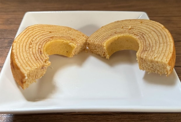 袋から出すとバウムクーヘン特有の素朴で優しい甘い香りが食欲をそそり、見た目も意外に厚みがあって食べ応えがあります。