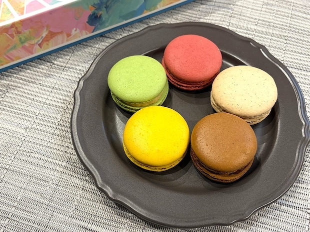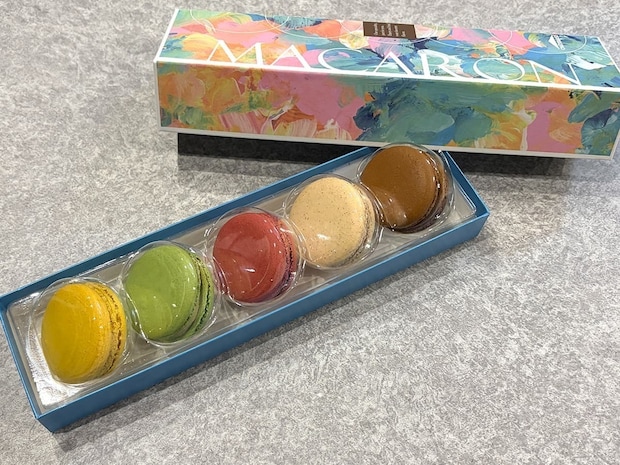 今回購入したシャトレーゼのマカロンは、チョコ、バニラ、フランボワーズ、ピスタチオ、シトロン(レモン)の5個入りで、価格は1,080円(税込)です。プラスチックケースで丁寧に梱包され、鮮やかな抽象画デザインのマットな質感の箱に入っているため、単品購入(1個162円・税込)より単価は上がりますがギフトに最適です。