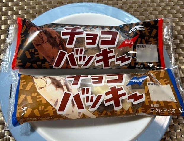 シャトレーゼで定番の人気を誇るアイス「チョコバッキー」です。パリパリとしたスイートチョコレートをアイスの中に重なり合うように混ぜ込むことで、まるで板チョコのような味わいを堪能できます。