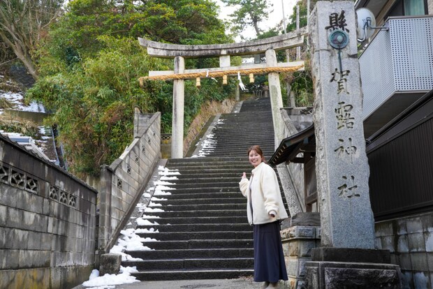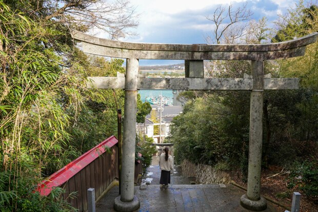 港のすぐそばに入口があるこちら側が正式な参拝の道とのことで、神社までは約130段の石段が続きます。