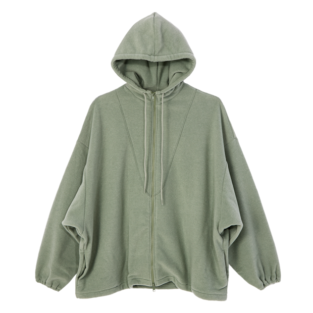 オーバーサイズのフーディは旬のフリース素材。ジップアップフーディ¥33,000(オニット/フェアズフェア)