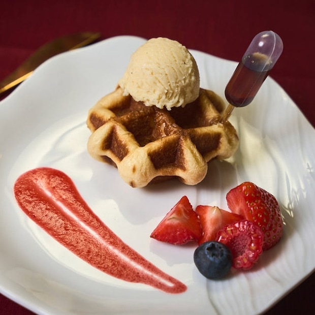 さらに、温かいワッフルにバニラアイスとメープルシロップ、いちごのソースが添えられたデザートが別皿で用意されるのもうれしいポイント。