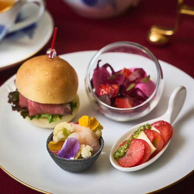 下段では、ローストビーフといちごバルサミコのミニバーガーをはじめ、いちごとトマトのカプレーゼや、いちごとビーツを使用した色鮮やかなオリーブのサラダなど、いちごの爽やかな甘酸っぱさを活かしたセイボリーを楽しむことができる。