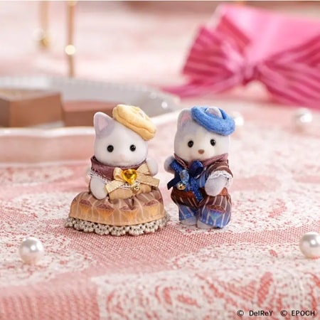 中でも注目は、「シルバニアファミリー×デルレイ ラテネコの赤ちゃん&ハスキーの赤ちゃん -ダイヤモンドショコラ-」だ。ダイヤモンド型のチョコレートが人気のデルレイ。そんなデルレイのアイコンでもあるダイヤモンド型のショコラをモチーフにした特別なドレスの赤ちゃんのペアセットだ。