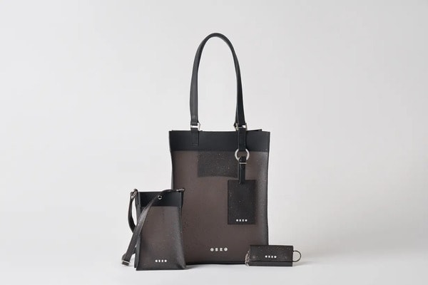 軽くて丈夫、かつ薄く柔らかい残革混合PVC「OBRO」に、重厚感のある牛革(日本製)という相反する素材を組み合わせた1stモデルは、トートバッグ、サコッシュ、キーケース。