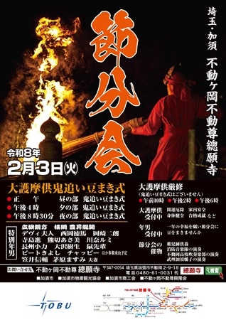埼玉県加須市の不動ヶ岡不動尊總願寺(そうがんじ)にて、伝統祭事「節分会(せつぶんえ) 鬼追い豆撒き式」が2月3日(火)に開催される。