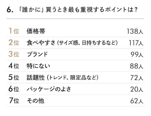 やはり今回も価格帯がトップに。この時期しか買えない限定チョコが多数出るけれど、価格高騰との戦いになりそう。プレゼントする際は賞味期限や要冷蔵など、保存状態も考えて購入する人も多数。回答数は少ないものの、ビジュアル重視という声も根強く、SNSにアップすることも意識している人も。