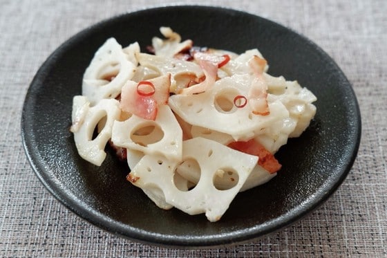 ベーコンの旨味とにんにくの風味がれんこんに移り、シンプルな塩コショウだけの味付けでも物足りなさはありません。