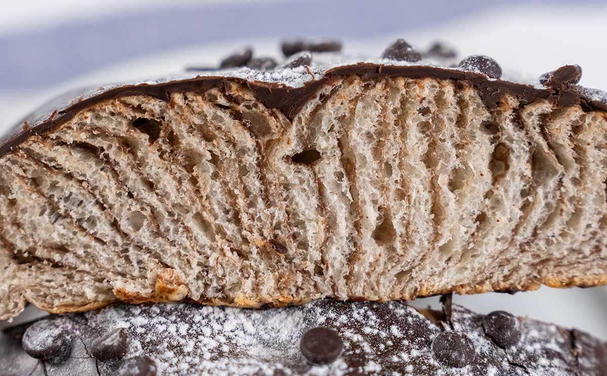 次は半分にカットして断面をチェック。生地とチョコシートが何層にもなっています。