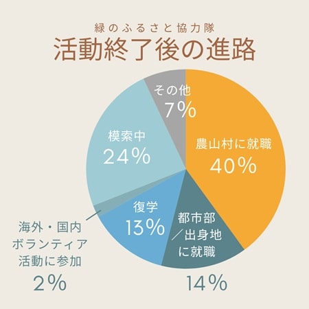 「緑のふるさと協力隊」は1994年にスタートしてから32年間で866名が参加。1年の活動を終えた若者の多くが「地域や人と出会い自分の世界が広がっていくことを感じた」「自分が進みたい道を改めて考えることができた」など自身の成長を実感している。受入先となった農山漁村でも「元気に活動する若者を見て地域に活気が生まれた」「なんでも学ぼうとする若者の姿勢に元気もらった」などの効果を実感し、8割が継続的に活動の受け入れを行っている。また1年間を通じて若者と地域が互いにかけがえのない存在となっていくことで“第2のふるさと”のようないつでも帰れる場所になることも。参加者が活動先に定住するなど、関係人口の創出や地域の活性化に寄与するとともに、参加者自身も活動を経て新たな進路選択や、その後の生き方を見つめ直すきっかけとなっている。