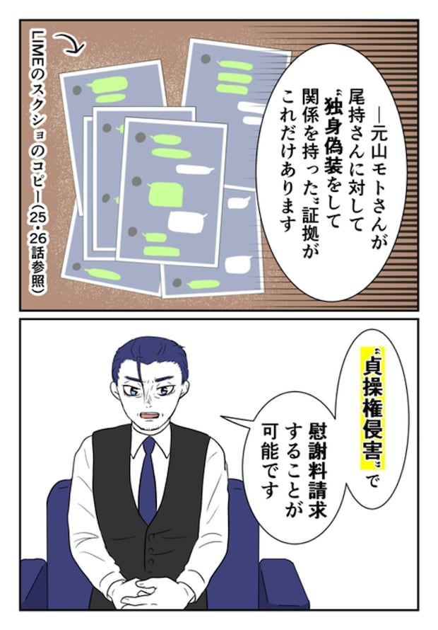 今回の一件で、一番の被害者は妻かもしれません…。ですが、「既婚者」と告げられず、不倫をしてしまった尾持さんもまた「被害者」なのです。尾持さんは弁護士に連絡し、モトさんに「貞操権侵害」の慰謝料請求を決意します。