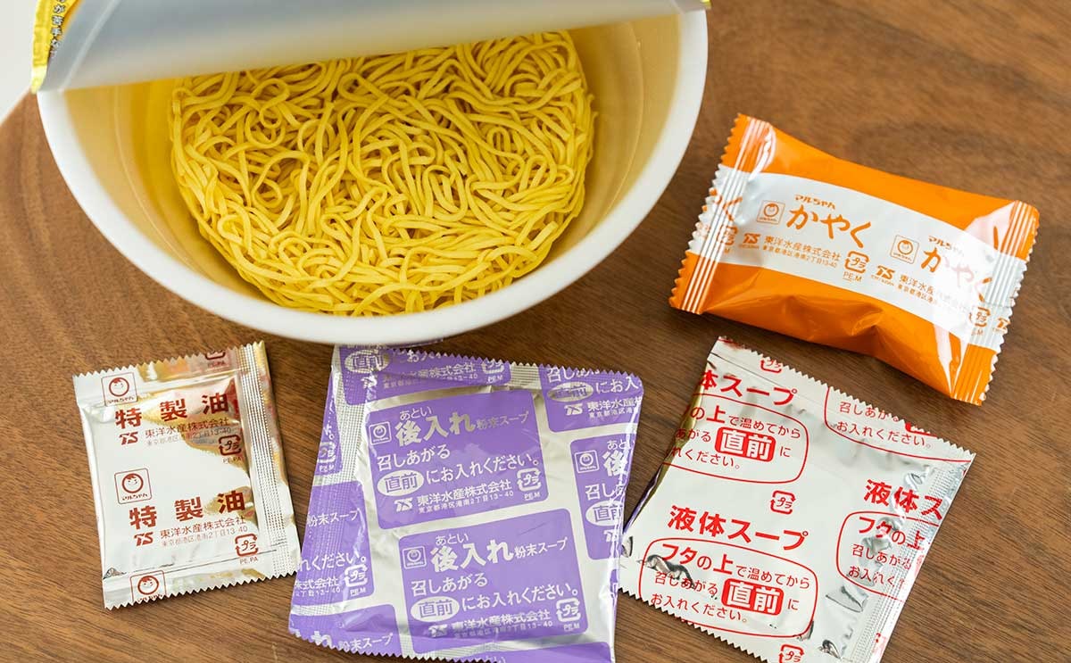 カップの中には、麺の他に「かやく」「液体スープ」「後入れ粉末スープ」「特製油」の袋が入っています。