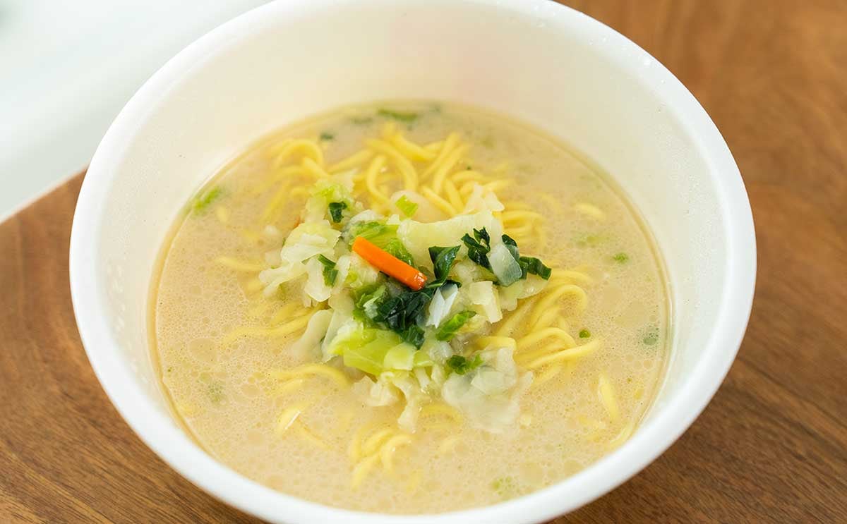 白いスープに具材(キャベツとたまねぎ、小松菜、ねぎ、にんじん)がたくさん入っています。