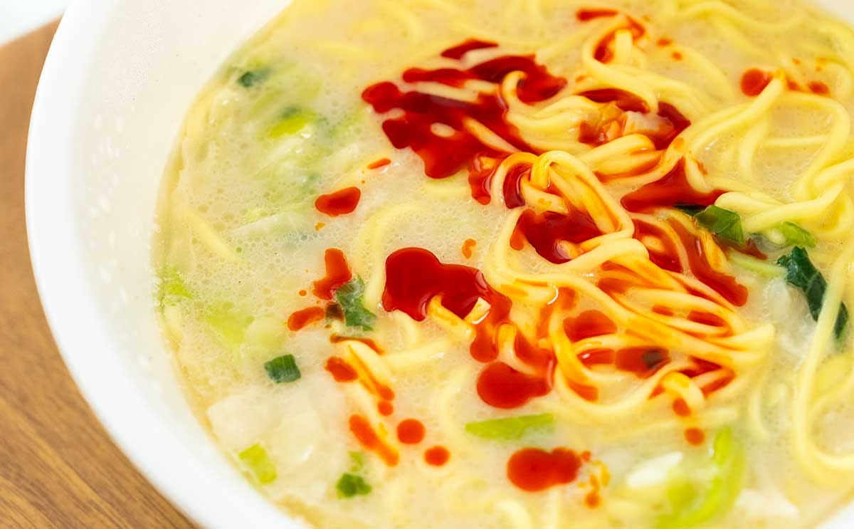ポークの旨みをベースに、野菜や魚介の旨みを加えた白いちゃんぽんスープは、ほどよい香辛料の風味とまろやかな味わいが特長。そのままでもとてもおいしいですが、途中でラー油入りの特製油を加えると、辛みがプラスされて旨辛な赤いスープに変化します。
