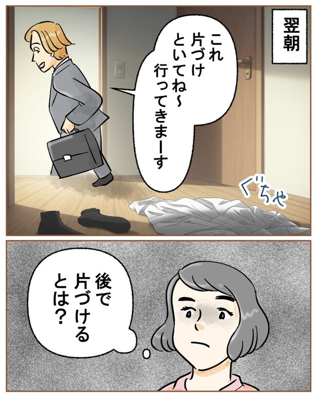![帰宅のたびに玄関からリビングまで順に脱ぎ捨てる洗濯物。翌朝ひと言「片付けといて」夫の嫌いなところ[5]|ママ広場マンガ](https://assets.mama.aacdn.jp/contents/27/2025/9/1759122032920_m6qg5rtgtc8.jpg?maxwidth=620)
