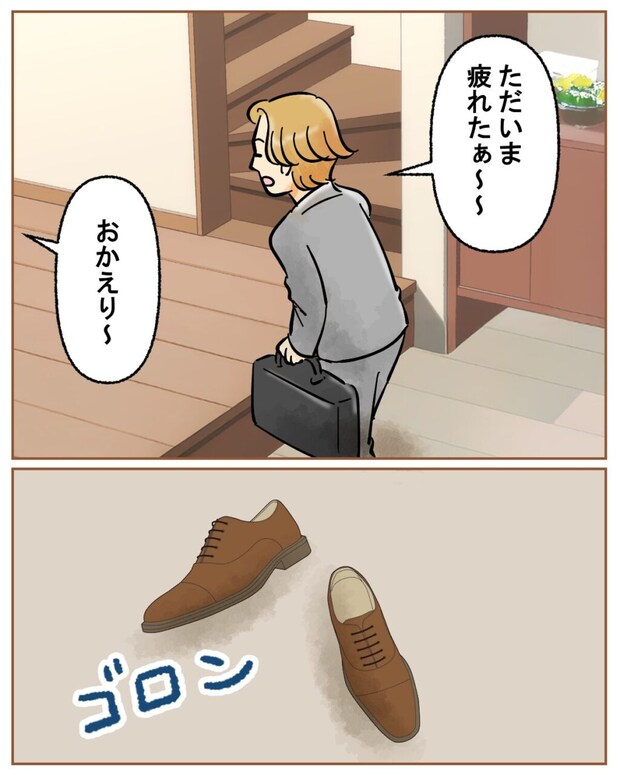 ツカサが会社から「疲れた~」と帰ってきました。先ずは玄関で無造作に靴を脱ぎ捨てます。