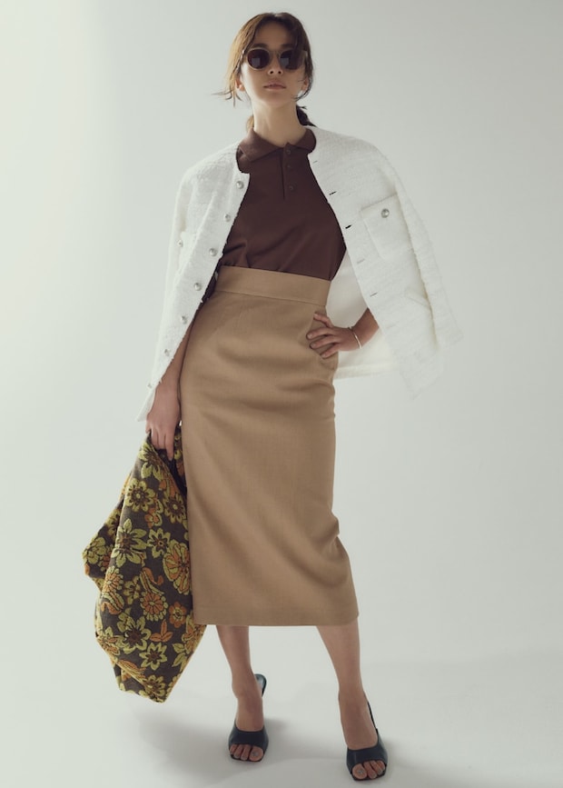 ツイードジャケット¥181,500(マディソンブルー)、ポロシャツ¥34,100(エイトン/エイトン青山)、スカート¥27,500(エッフェ ビームス/デミルクス ビームス 新宿)、サングラス¥20,900(ロンハーマン)、バングル¥37,400(ブランイリス/エストネーション)、バッグ¥42,900(アンスクリア/アマン)、ミュール¥66,000(ギア ボルギーニ/ユナイテッドアローズ 六本木ヒルズ店)