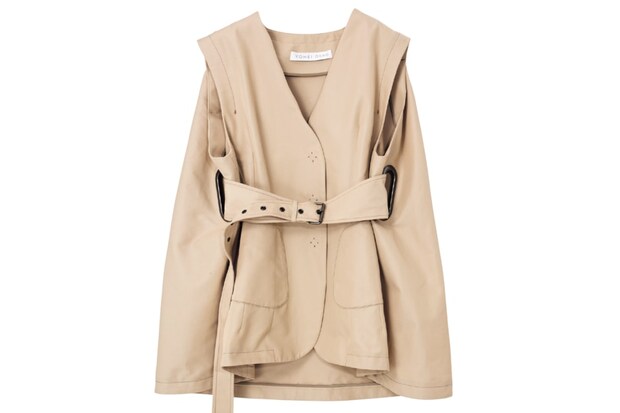 「ハトメを使ったディテールが新鮮。肩にあるホールに腕を通してベストのように着用しても、裾から腕を出してジャケットとしてきちんと着ても決まる万能アイテム」