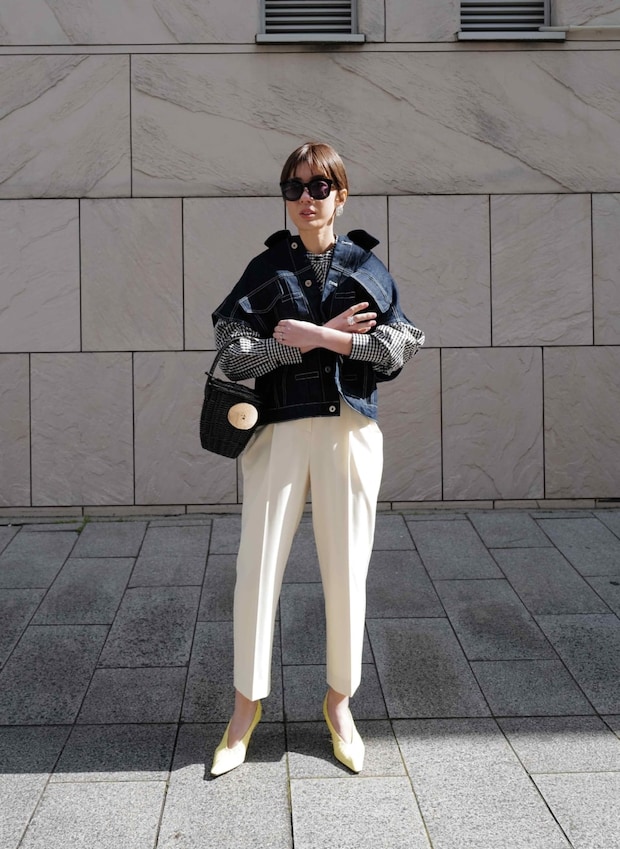 「チェックシャツ×テーパードパンツのベーシックなコーディネートに、デニムベストを羽織って旬の着こなしにアップデート。さらに、パンツのホワイトや足元のイエローで春らしさも意識しました。デニムベストは少し後ろに襟を抜いて着るのがこなれて見えるポイント」