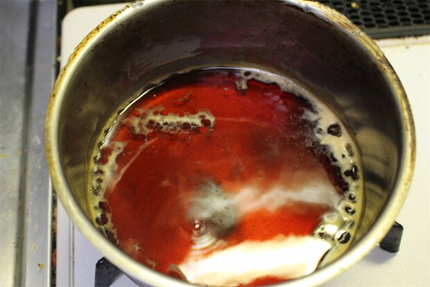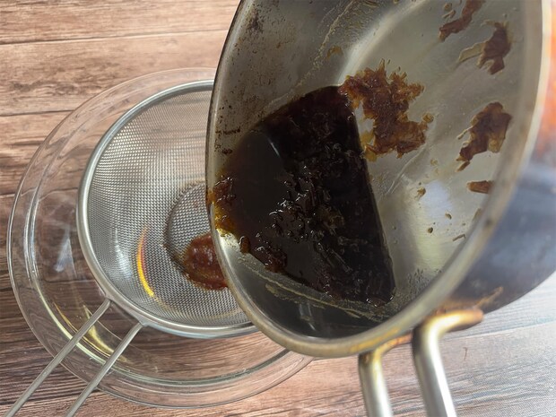 3. 火を止めたらかつお節を入れます。かつお節が沈んだら、ザルなどで濾します。