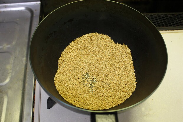4. フライパンを中火で熱し、いりゴマの香りが立つまで数十秒〜1分乾煎りします。香りが立ち始め、さらに「パチッ」「カリッ」といった弾けるような音が聞こえ始めたら、ちょうど良い目安です。