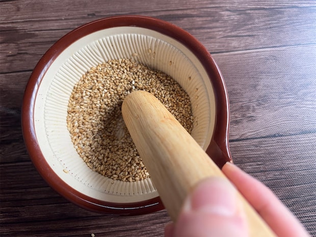さらに、すり鉢とすりこぎですりつぶすことで香りがグッと引き立ちます。軽く数回すりつぶす程度でOK。