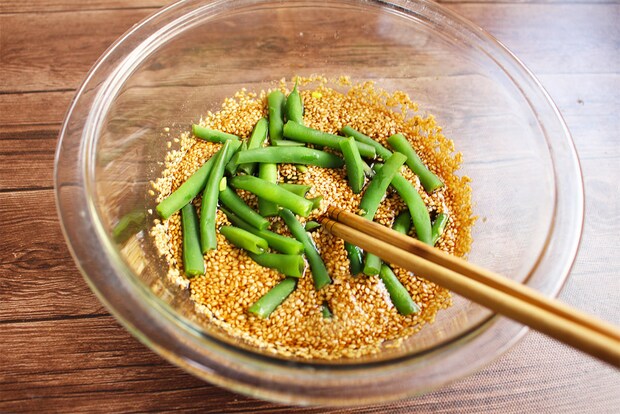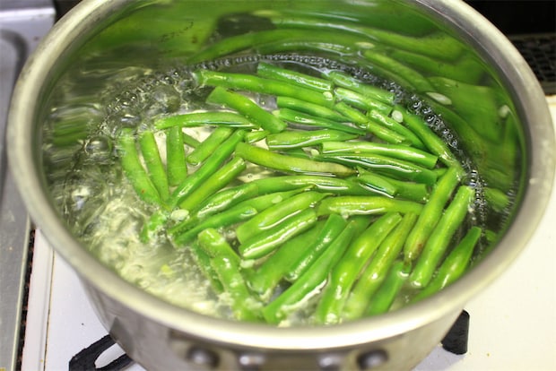 6. 鍋に水と塩適宜(ともに分量外)を入れ沸かし、いんげんを約2分ほど茹でます。鮮やかな緑色になれば茹で上がりです。