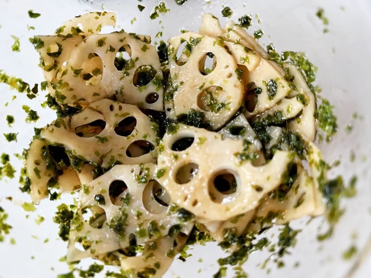 うすく切ったレンコンと和えたのは…? できた一品に「夫と子供がハマった!」