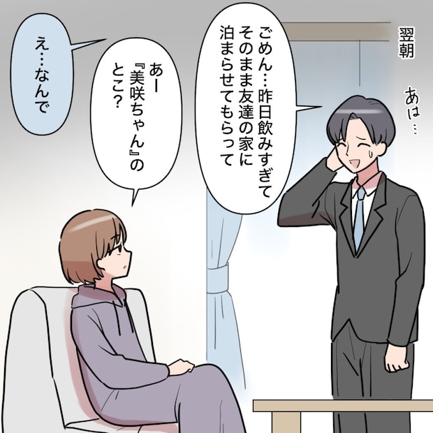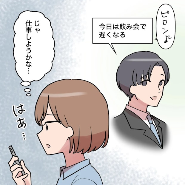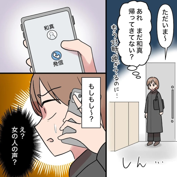 田中さんに押し付けられた資料の修正を終え、家に帰宅したのは23時過ぎ。けれど、家の中に人の気配はありません。「あれ、まだ和真帰ってきてない?」飲み会でも、いつもならここまで遅くなることはないのに・・・。心配になって和真に電話をかけると、「もしもし~?」という女の人の声が聞こえてきました。
