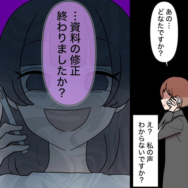 「あの・・・どなたですか?」恐る恐る問いかけると、電話の相手は「え?私の声わからないですか?」と返してきました。私は心当たりがなく、言葉を失ったまま黙っていると、次の瞬間「・・・資料の修正、終わりましたか?」と思いもよらない一言を投げかけられたのです。