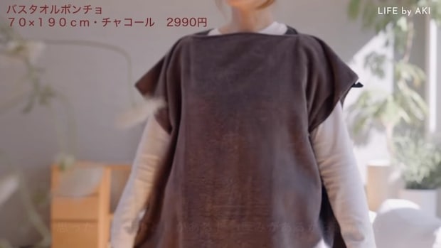 お風呂上りは、子どもの体を拭いたり保湿したりと、なかなか自分の服を着られないというママも多いのでは?そんなときにはこの「バスタオルポンチョ」をサッと羽織ればOK♪湯冷め防止にも役立ちます。身長154cmのakiさんが羽織ると、ひざより少し上くらいの長さだそう。適度な厚みがありますが、タオル地なので乾きやすく、日常使いもしやすい!冬場のお風呂上がりの心強い味方になってくれそうですね。