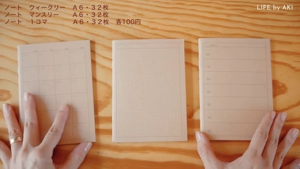 akiさんは、手帳代わりにもなる「マンスリー」の他、1週間の献立記録用に「ウィークリー」、アイデアなどのメモ用として「1コマ」の3種類を購入。どれも自分で日付を記入するタイプなので、思い立った日からすぐに記入でき、無駄なページが出ないのがうれしいですね。