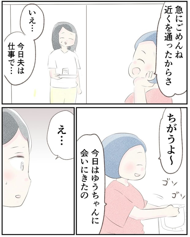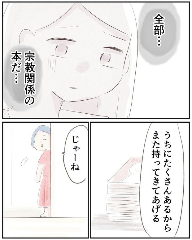 あるとき突然、義姉がゆうさんに会いにやってきます。義姉は「離婚」の話を知っていて、ゆうさんに宗教関連の本を読んでみてと言って帰っていきました。おそらく夫が義姉に離婚について話したのだと思い、ゆうさんは嫌な気持ちになってしまいます。