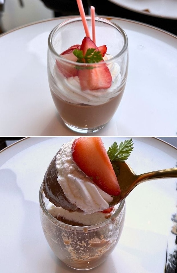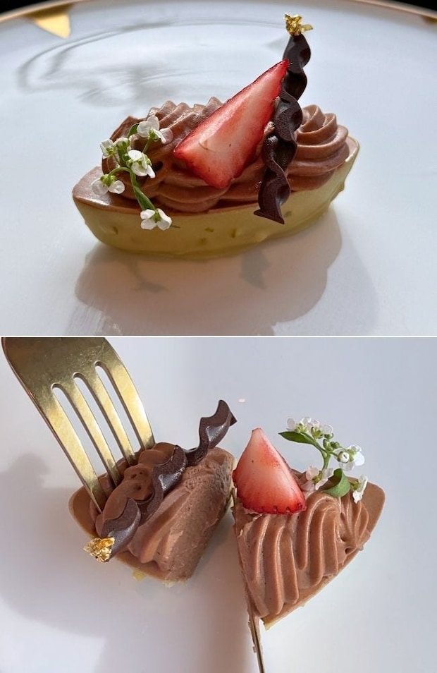 白山シェフおすすめのスイーツ2品目は「ストロベリーと小田原紅茶ショコラムース」。こちらはミルクチョコレートとスイートチョコレートの2種類を使用しており、先ほどのパンナコッタと比べると、よりミルキーでチョコレートの甘さをしっかりと感じられます。
