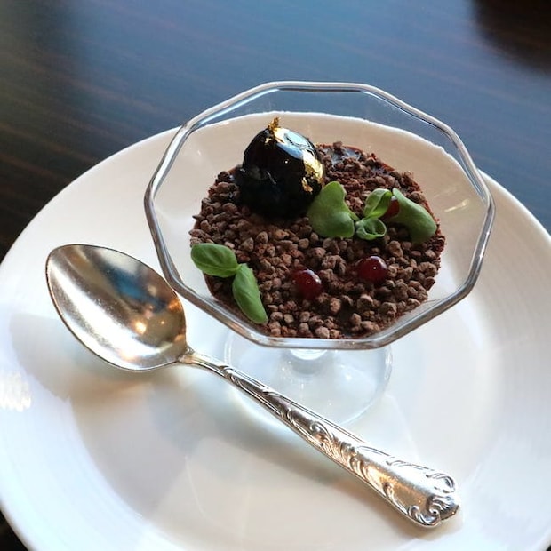 グラスで提供される「ショコラヴェリーヌ」が今回のスペシャルデザート。さくらんぼのコンフィチュールに、チョコレートクリームを重ねており、その上には、カカオ豆を覆う白い果肉であるパルプのパウダーを使った酸味のあるチョコレートと、甘くビターなチョコレートの2種の粒がのっています。さらに、サワーチェリーをシロップ漬けにしたアマレナチェリーとバジルの葉が添えられており、まるで土から芽が出ているかのような、遊び心満点の盛り付けにときめきました。