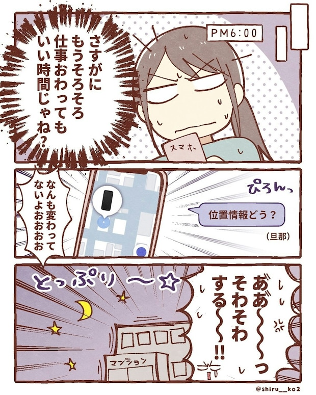 18時を過ぎても、スマホの位置情報が変わらないことに そわそわしている しる子さん。