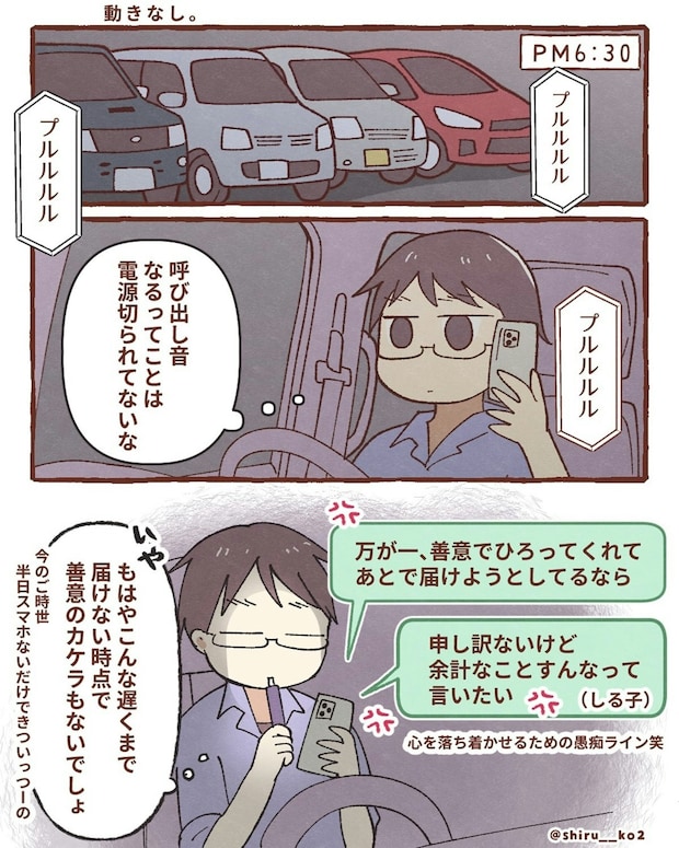 18時半になっても何の音沙汰もないため、紛失したスマホに電話をかけてみた、夫。すると、着信音が鳴ったため、「電源は切られていない」と確信します。そして、20時ごろ、しびれを切らしたしる子さんは、紛失したスマホにメッセージを送り、遠隔アラームを鳴らします…。
