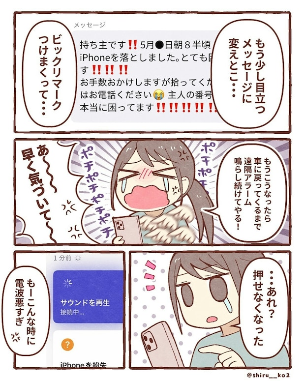 一向に連絡も変化もないことにいらだち、なくしたスマホにメッセージを送り、遠隔アラームを押し続けた、しる子さん。すると、急にアラームが押せなくなります。