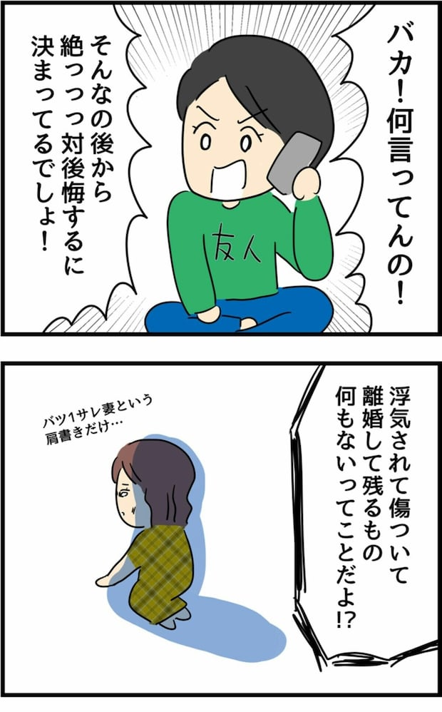 夫の不倫が発覚し、今まで一緒に過ごした4年間が一瞬にして崩れてしまったように感じたリナさん。こらえきれず親友に電話をかけます。すると「まだ好きな気持ちはある?」と聞かれます。改めて自分が夫のことをどう思っているか考えました。