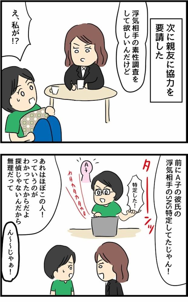 次は、不倫の証拠を集めるため、以前、探偵並みの腕前を披露した友人を頼ります。最初は自信がなく、渋っていた友人でしたが「ランチをご馳走する」という約束で、不倫相手の素性を探ることに合意。すると…。