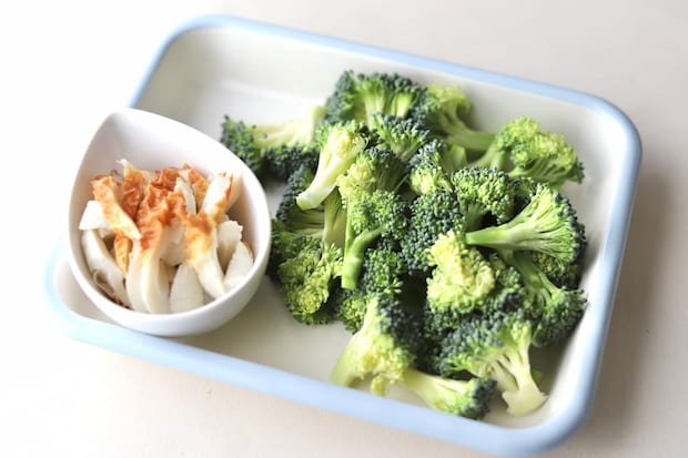 1. ブロッコリーは小房に切り分け、ちくわは縦半分に切って斜めに7mm幅に切る。