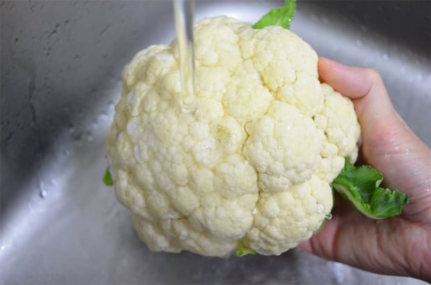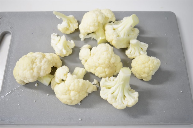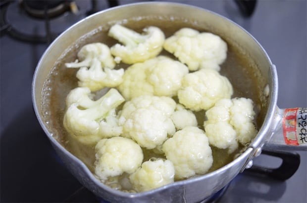 1. カリフラワーを洗い、一口サイズに切ったらさっと茹でる。