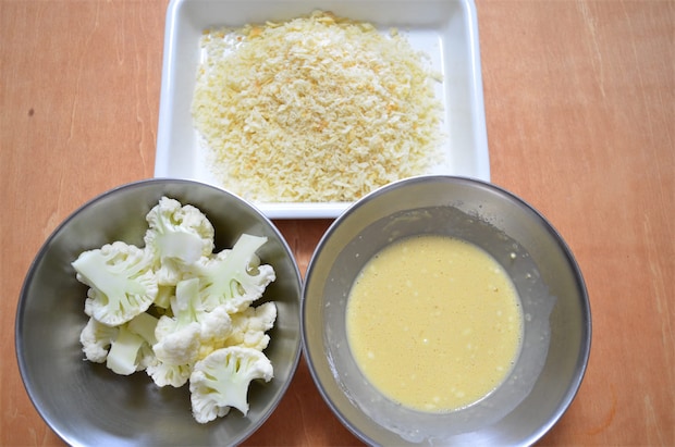 2. 卵と水と小麦粉を混ぜて、バッター液を作る。カリフラワーをバッター液にくぐらせてパン粉を付けたら、熱した油に入れ、きつね色に揚げる。