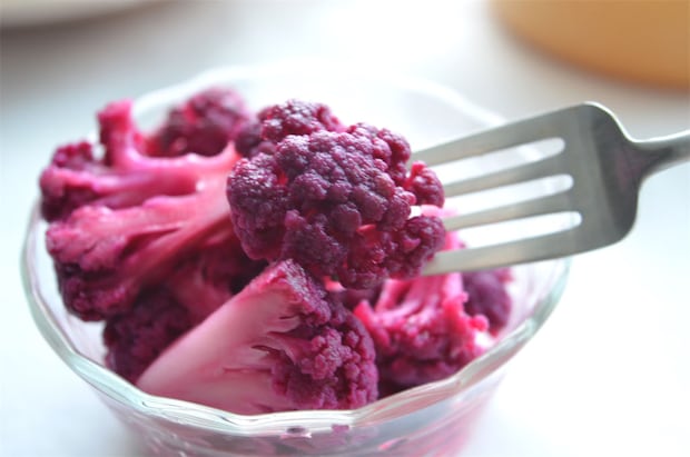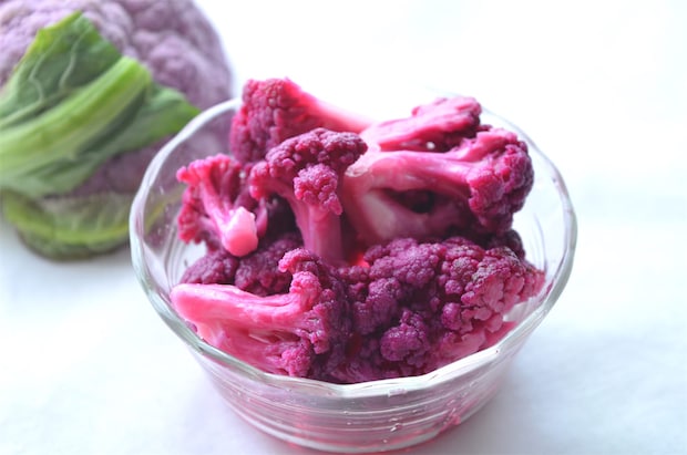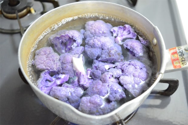 ※白いカリフラワーでも作れますが、紫のカリフラワーは酢漬にすると鮮やかな赤紫色になるのでオススメです。