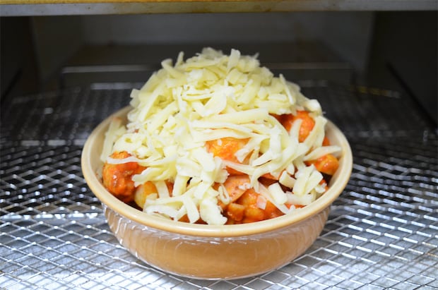 3. 1と2とミートソースを混ぜて耐熱皿に入れ、チーズをのせてオーブンで焼く。