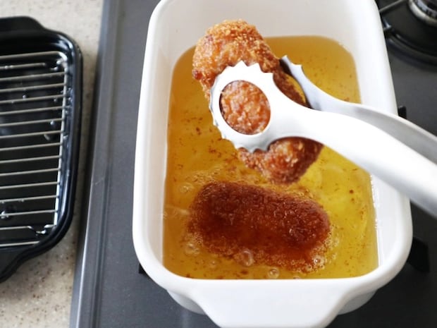 『家事問屋 揚げものトング』は30cmの⻑さがあり、持ち⼿が⻑いので、はねた油が⼿にあたりにくく、揚げもの調理のストレスが少なくなります。ステンレス製で揚げ油に⼊れても溶けません。先端がギザギザなので、柔らかいクリームコロッケなどもしっかりキャッチできます。