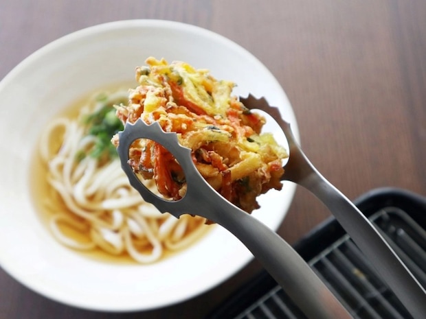 軽い⼒で開閉できるので、柄の端を持ってもしっかり掴めます。先が⽳状になっているため、かき揚げのような凸凹した揚げものも具材を⽳に逃すようにホワっとキャッチできるので、潰さずしっかりキャッチ!器⽤さが求められる菜箸や、ぽってりした⾯でキャッチするタイプのトングに⽐べて、エアーな使い⼼地はクセになること間違いなし。